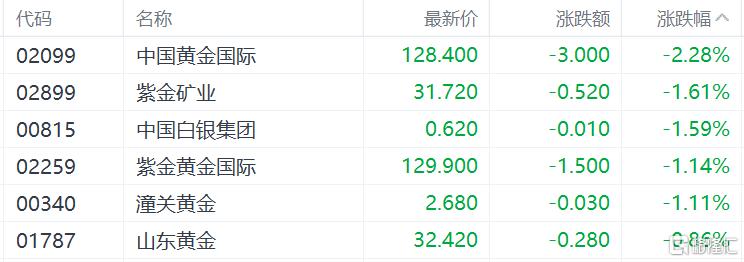 黄金股集体下跌,中国黄金国际跌2.28%,紫金矿业、中国白银集团、紫金黄金国际、潼关黄金跌超1%,山东黄金跌0.86%。