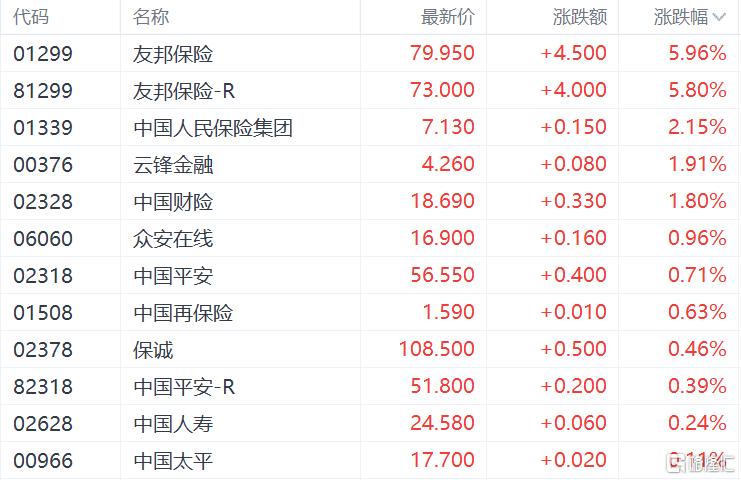 大摩维持对保险股全年业绩正面看法,增长超预期友邦保险涨近6%表现最佳,中国人民保险集团涨超2%,云锋金融、中国财险涨超1%,众安在线、中国平安、中国再保险跟涨。