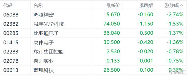 苹果概念股普遍下跌,鸿腾精密跌2.74%,舜宇光学科技、比亚迪电子、高伟电子跌超1%。