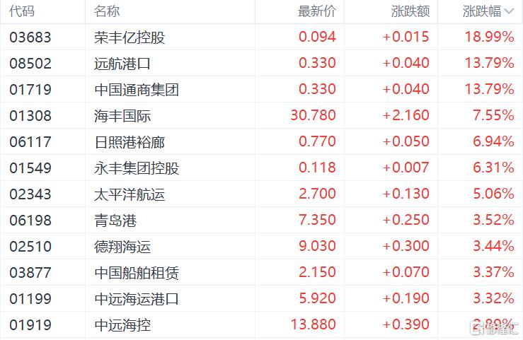 港口运输股普涨,远航港口涨超13%,海丰国际涨超7%,太平洋航运涨超5%,青岛港、中远海运港口、中远海控跟涨。
