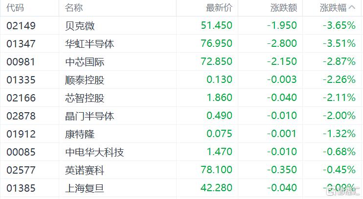 半导体股普跌,贝克微、华虹半导体跌超3%,中芯国际、芯智控股、晶门半导体跌超2%。