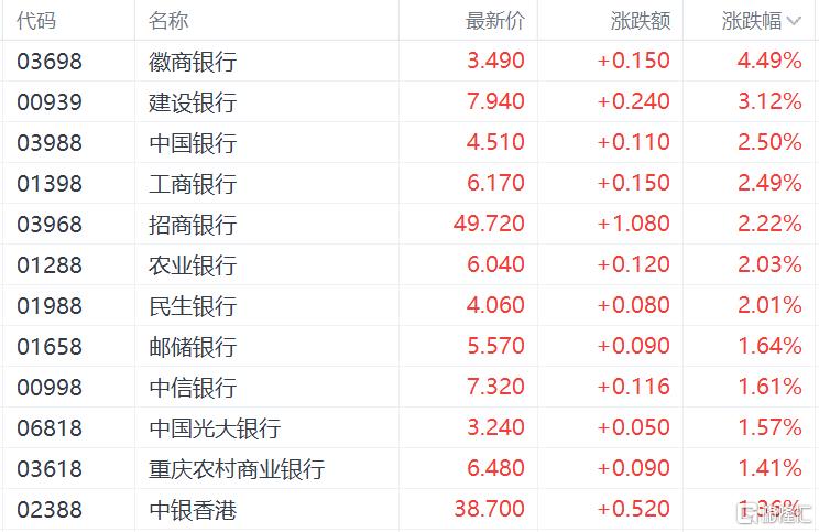内银股拉升上涨,徽商银行涨超4%,建设银行涨超3%,中国银行、工商银行、招商银行、农业银行涨超2%。