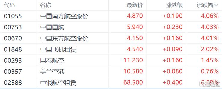 航空股悉数回暖,中国南方航空股份、中国国航、中国东方航空股份涨超4%,国泰航空涨1.45%,美兰空港涨0.76%。