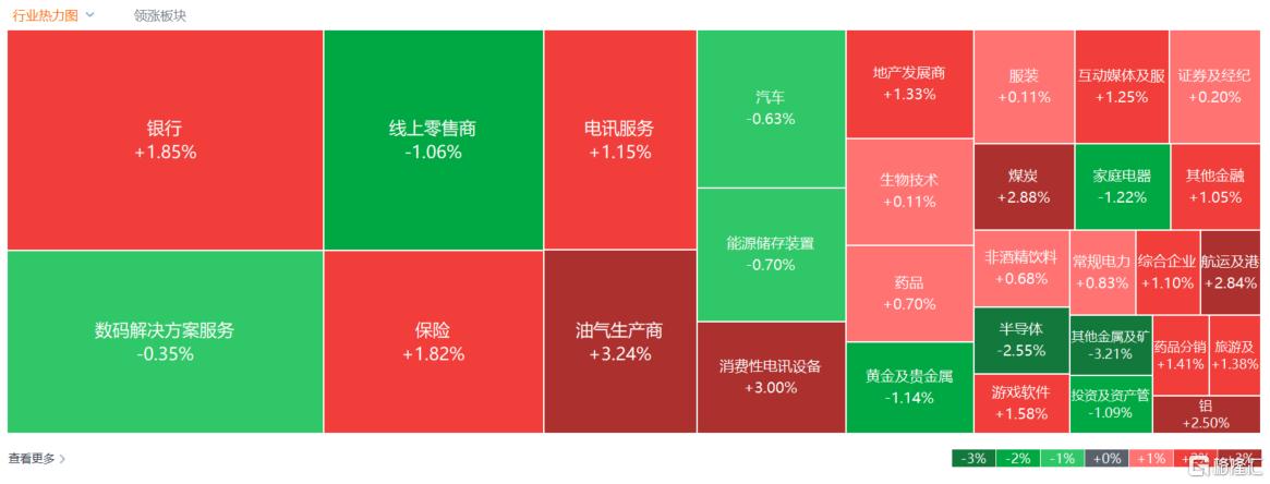 盘面上,大型科技股涨跌各异,小米涨3.5%,百度、美团飘红,阿里巴巴跌超1%;欧佩克+拟明年Q1暂停增产,大摩上调短期油价预期,三桶油全天强势,中国石油股份涨超3%刷新阶段新高;煤炭季节性消费旺季正式拉开序幕,煤炭股集体活跃;内银股、保险股、新能源汽车股、航空股、风电股、生物医药股集体上涨。另一方面,黄金交易税收政策调整,黄金股、珠宝首饰股跌幅最为明显,明星股老铺黄金大跌超7%,中国黄金国际、紫金黄金国际均下跌;半导体股继续弱势,苹果概念股、家电股、零售股普遍下跌。
