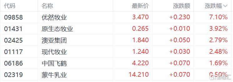 乳制品股表现活跃,优然牧业涨7.1%,原生态牧业涨3.92%,澳亚集团、现代牧业涨超2%,中国飞鹤、蒙牛乳业跟涨。