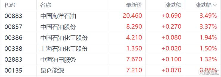 石油股涨幅居前,中国海洋石油、中国石油股份涨超3%,中国石油化工股份、上海石油化工股份、中海油田服务涨超1%。