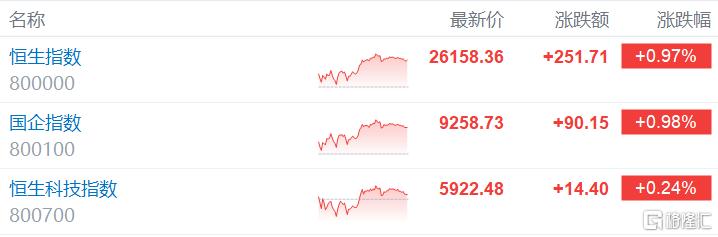 11月3日,港股三大指数午后开盘呈现快速拉升行情,11月首日迎来开门红行情。恒生指数涨0.97%,国企指数涨0.98%,恒生科技指数转涨至0.24%。