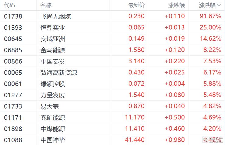 煤炭股集体拉升走高,细价股飞尚无烟煤飙涨91%,中国秦发涨超7%,易大宗、兖矿能源、中煤能源涨超4%。