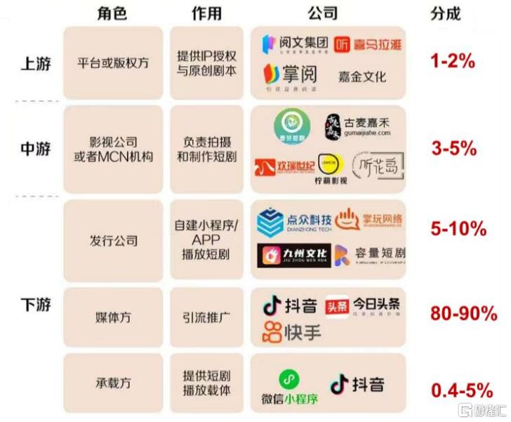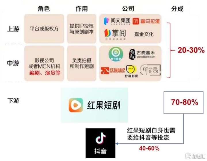 免费短剧APP或可给上、中游更多分成。除了依赖在短视频等平台高价投流的模式,部分剧目也以红果短剧这样的APP作为增量渠道——一般来说,一个剧目在抖音平台和红果短剧上线期间存在“窗口期”,先在抖音平台采用IAP收费后再以免费模式上架红果短剧(5月抖音成立短剧版权中心的目的之一,就是为了统筹剧目版权在不同平台上线时间差,以免混淆),当然现在也有部分剧目直接首发上架红果短剧的情况。整体来看,红果短剧采用广告分账机制,可使:1)产业链上、中游获得比传统投流模式略高的分成比例(如红果短剧获得70-80%收入,剩余部分则留给上、中游);2)红果短剧内部有针对编剧和演员的分账机制,创新激励力度更大;3)但同时红果短剧作为平台方亦需要向外投流来获取用户(约40-60%重新投向抖音等字节系平台)。