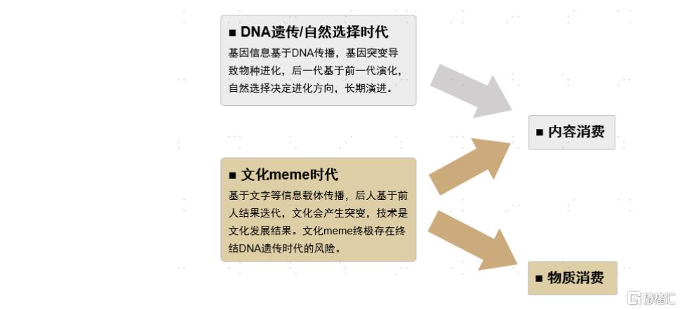 “消费升级”的另一面。如果我们将消费大致定义为物质消费和内容消费,前者从历史上看(尤其是工业革命以来)“消费升级”可以说是主要趋势,即随着人民的经济生活水平不断提升,人们几乎总是追寻更高品质的物质生活,品牌化等趋势也应运而生。然而,如果我们简单地把物质消费中消费升级的趋势套用到内容消费上,则会发现存在一些不可解释的现象。例如,制作简单、内容门槛低的短视频相较制作成本更高、画面质量更好的长视频,前者反而获得了更多用户流量,这看似和“消费升级”的趋势相违背。我们认为其原因可能来自两者底层驱动有所区别,根据理查德道金斯《盲眼钟表匠》对于生物进化论的定义,其认为基于DNA基因遗传是当下地球所有生物自然演化的核心规则和底层原动力。但是人类从发明文字后,开启了新一代基于文化meme的新的演化时代,其产物包括当下科技、文化等。自然演化速度相对较慢,以百万年为基础单位,而文化meme演化速度则显著更快,从最早楔形文字到现在也就3000多年。我们认为人类物质消费更多受到文化meme演化时代影响,而内容消费则同时受到DNA遗传和文化meme演化时代双重影响。其中,考虑原始人类物质获取基本等于生存活动,很难产生剩余价值和交换,因此物质消费更多是现代文化产物。相较内容(精神)消费则不同,其有用类信息获取和生存直接相关,而诸多“爽感”内容很多则和基因偏好相关,这类似对于甜的喜爱和对于苦的排斥。当然,现代文化对于内容消费影响同样十分深厚,例如迪士尼“合家欢”内容底层的价值观就与诸多人类历史哲学人生观、价值观思考契合。由此,物质消费的底层消费升级很可能来自于现代文化内涵影响(类似技术发展必然是不断进步),然而精神消费则似乎受基因和文化双轨制影响,并不是单一的“消费升级”的趋势。