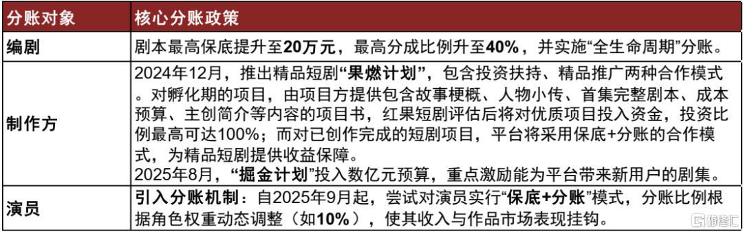 短剧亦开始聚焦优质内容竞争,红果短剧加大分账力度。随着行业竞争增强,短剧内容质量被逐步重视——而建立科学、公开透明、完全依赖市场的分账机制则可以更快将规模优势转化为质量优势,实现从做大到做强。而从实操层面,相对长剧具备较强非标属性,短剧更易于标准化和数据化。以红果短剧为例,除制作方外,其近期引入编剧、演员等分账机制(如剧本最高分成比例可达40%、演员分账比例可达10%等措施),激励优秀剧本及优秀演出质量,进一步以分账机制撬动各方积极性。
