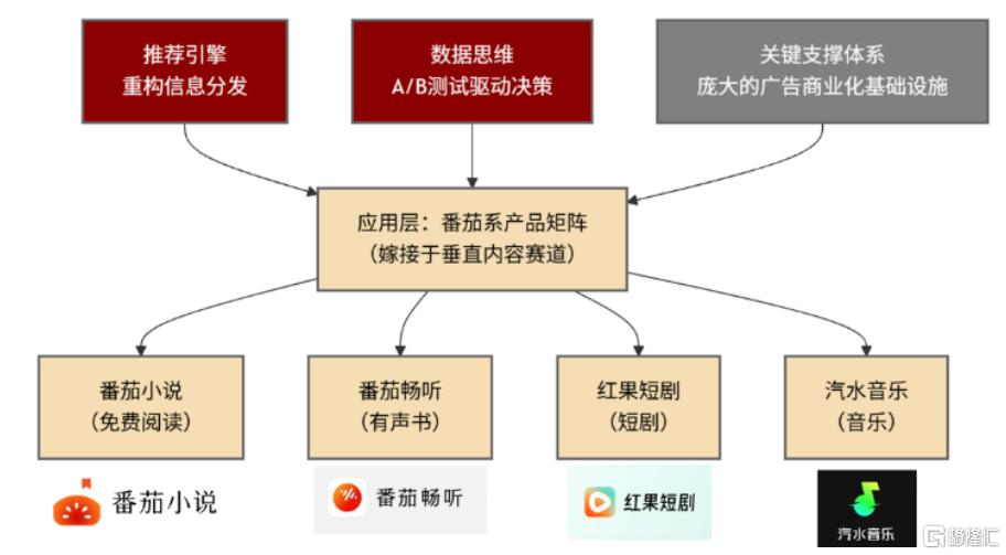 从番茄小说开始,字节跳动相继又推出了番茄畅听、红果短剧、汽水音乐等一系列以推荐为主的内容垂类赛道应用,我们认为本质上是推荐重构信息分发逻辑的延续,但是嫁接在更垂直的内容赛道。这些赛道历史上就是重要用户娱乐需求所在,但其此前往往都被“头部内容”的供给驱动需求逻辑主导,认为头部内容才能吸引用户收视率和付费价值,而头部内容标准由行业经验人士制定,从历史经验来看,判断成功率并不高。然而,字节将类似数据驱动逻辑引入,其结果就是反而建立了需求驱动供给新循环,打开更大的市场空间同时建立新的内容生态。其背后的驱动力我们认为一方面显示了用户需求的多元化,相对于用户对头部内容的有意识消费,用户对符合自己喜好的多元内容的潜意识消费反而是更大蛋糕;另一方面,更大的需求意味着更大的市场,从而吸引更多内容创作者。而推荐分发和数据驱动的运营逻辑在市场反馈——制作收益上形成更直接的市场机制,反而驱动了一个更繁荣内容供给市场。最后,互联网发展已经30年有余,免费+广告已经被验证为互联网规模最大、最主流商业模式,而字节具有庞大的商业化广告变现基础设施,其同样也成为这些产品能够弯道超车的原因。