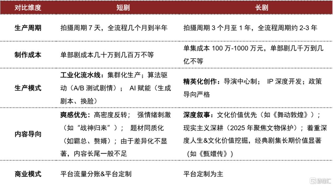生产模式的范式变革。从供给侧来看,短视频和短剧相对于长视频内容制作成本更低,制作周期更短,几乎完全市场导向,这些特点导致其能够更快响应用户需求,更低成本意味着更高容错率,这一系列特点使得短视频、短剧生产相对需要投重金,制作周期更长的长视频内容更加标准化,且更加容易建立工业化生产体系。此外,内容核心是创意,创意本身并没有太多专业或者非专业之分,相对于更加中心化的长剧创作流程,短剧创作更加去中心化,类似UGC短视频,短剧更容易激发广泛的创意。最后,短剧更多采用市场化分账模式,内容好则收益好,市场反馈直接。而长剧则更多采用定制模式,其中涉及到诸多人为制定规则环节,市场反馈链条显著更长。当然,我们并不能简单说短剧和短视频必然未来会完全替代长视频制作模式,后者在制作更加需要重金投入的、画面更精良、制作更宏大等内容维度依然有价值,其依然更容易产生具有辨识度的IP,且经典精品内容生命周期依然在变长,例如基于云合数据,《甄嬛传》在上线接近15年以后依然能够稳居全网有效播放量TOP30。然而,面对在多个维度有优势的短剧制作模式,长视频显然更需要差异化定位。