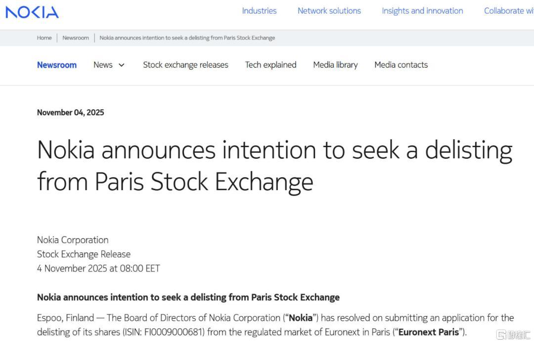 11月4日,诺基亚官网宣布,诺基亚公司董事会已决议提交申请,将其股票(ISIN:FI0009000681)从巴黎泛欧交易所的监管市场退市。诺基亚表示,股票从巴黎泛欧交易所退市,需经巴黎泛欧交易所董事会批准。预计在获得巴黎泛欧交易所董事会批准后,退市程序将于未来三个月内正式生效。退市流程的进一步细节将根据相关要求另行公布。