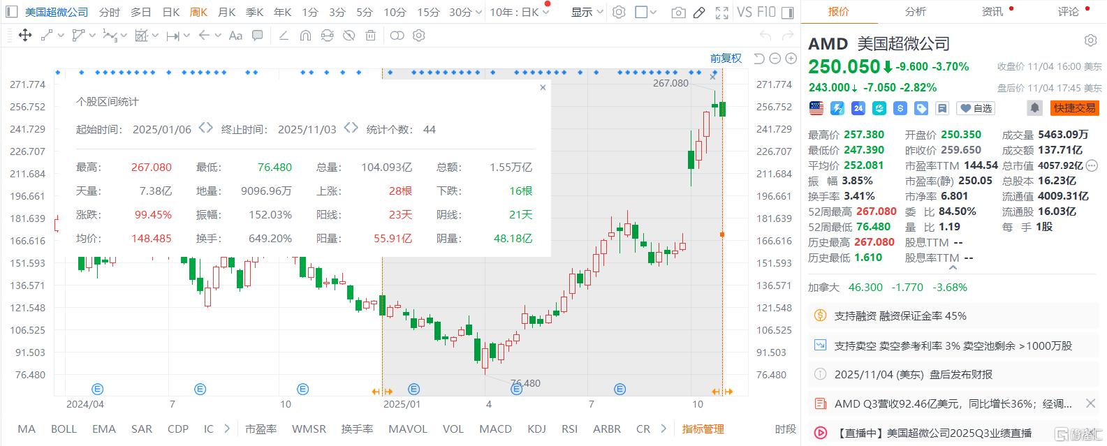 盘后公司股价一度跌约3%,截至发稿跌2.82%。而AMD股价年内涨幅接近100%,周二收于250.05美元。