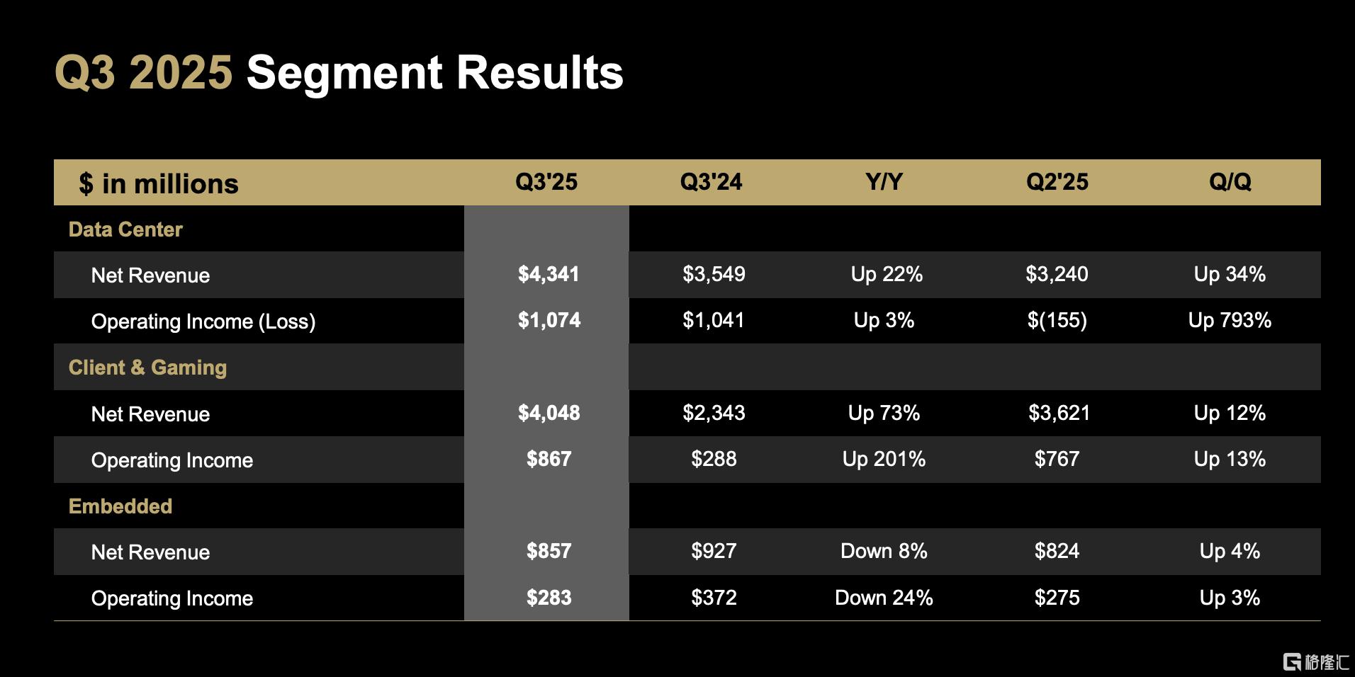 数据中心业务收入达到了43亿美元,同比增长22%,主要得益于对第五代AMD EPYC™️处理器和AMD Instinct MI350系列GPU的强劲需求。