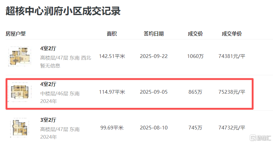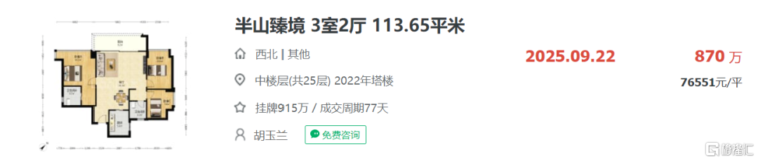 而同地段的同户型房源,二手房住宅如今成交也已经到了新低。同类户型9月成交一套约113平房源,成交总价只有870万,折合单价约7.655万/平,几乎拉到了与龙华核心地段的优质小区成交单价同样的水平。