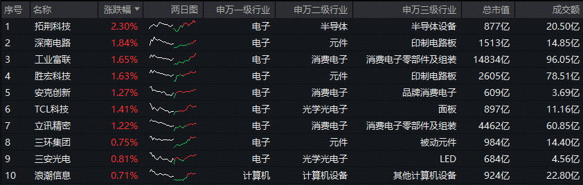 成份股方面,拓荆科技涨超2%,深南电路、工业富联、胜宏科技、立讯精密等个股涨逾1%。另一方面,传音控股跌超4%,闻泰科技跌逾3%,跌幅居前,拖累指数表现。