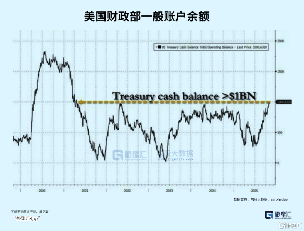 可以看财政部的一般账户,到上周五收盘,美国财政部存放的现金已经超过1万亿美元,这是五年来首次突破这个水平,也是自21年4月以来的最高值。