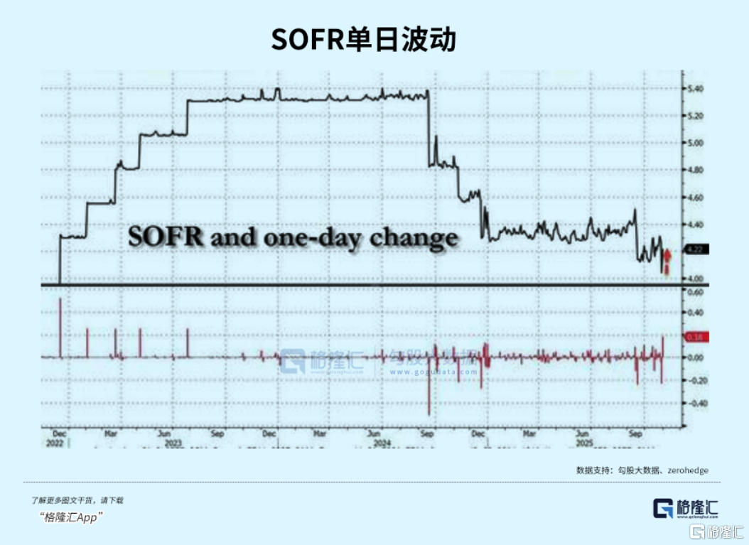 就在上周五,10月31日美国的SOFR(担保隔夜融资利率)飙升了22个基点,这是一年来最大涨幅,达到了4.22%。考虑到上周美联储是降息,这个隔夜利率应该是下降才对,但实际情况却像是美联储没有降息。