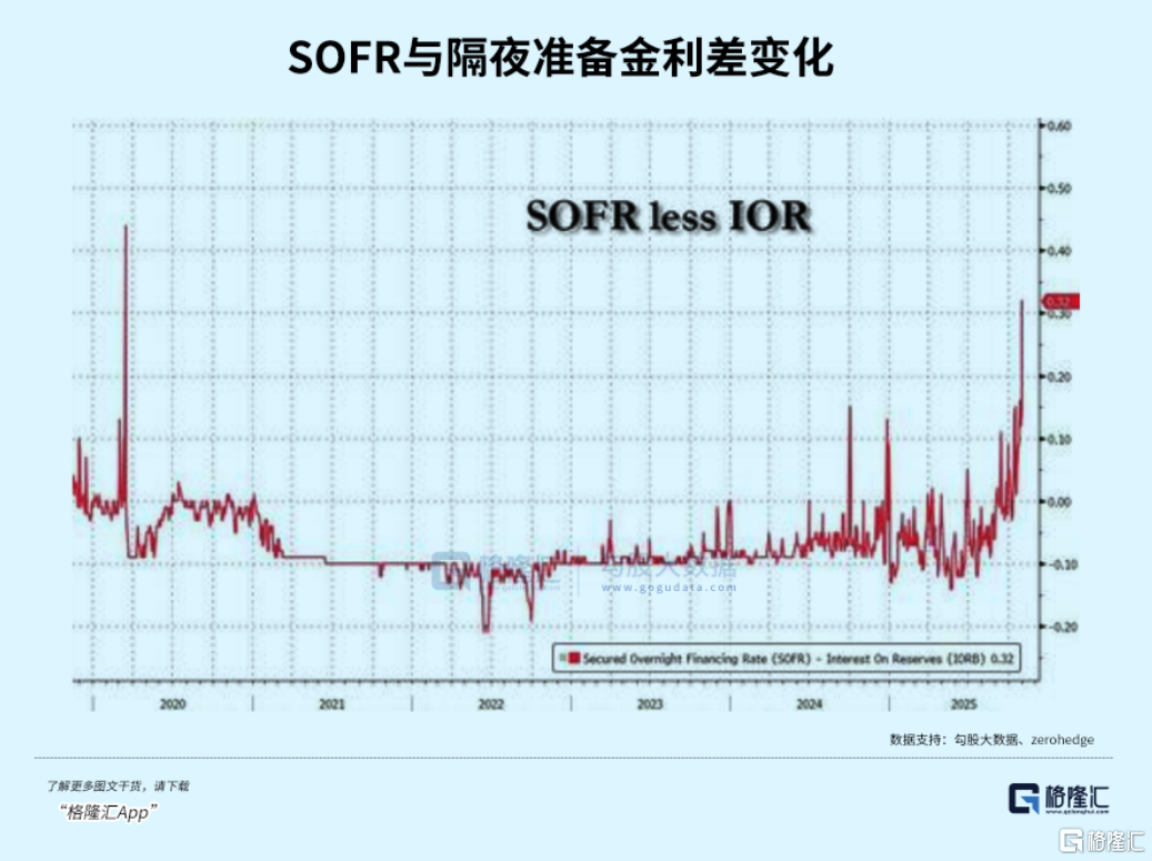 上面这张图你们可能还看不出严重性,如果用SOFR对联邦基金利率进行标准化,即显示SOFR对隔夜准备金利率(联邦基金利率走廊的实际中线目标)的溢价,你们就可以发现情况有多么糟糕了。上周五利差飙升了32个基点,这是20年3月以来最高水平。20年3月是什么背景,我想大家应该知道。