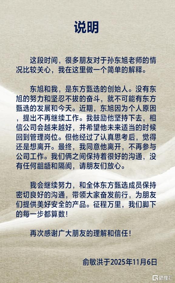 俞敏洪在说明中提到,“东旭和我,是东方甄选的创始人。没有东旭的努力和坚忍不拔的奋斗,就不可能有东方甄选的发展和今天。近期,东旭因为个人原因提出不再继续工作。我鼓励他坚持下去,相信公司会越来越好,并希望他未来适当的时候回到管理岗位。但他经过了认真思考后,觉得还是想离开。最终,我同意他离开,不再参与公司工作。我们俩之间保持着很好的沟通,没有任何龃龉和隔阂,请朋友们放心。”