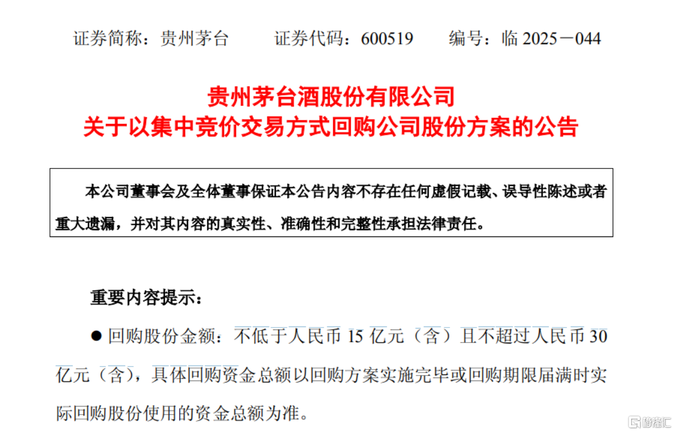 与此同时,贵州茅台计划以集中竞价交易方式实施股份回购,回购资金总额不低于15亿元且不超过30亿元,回购价格不超过1887.63元/股。