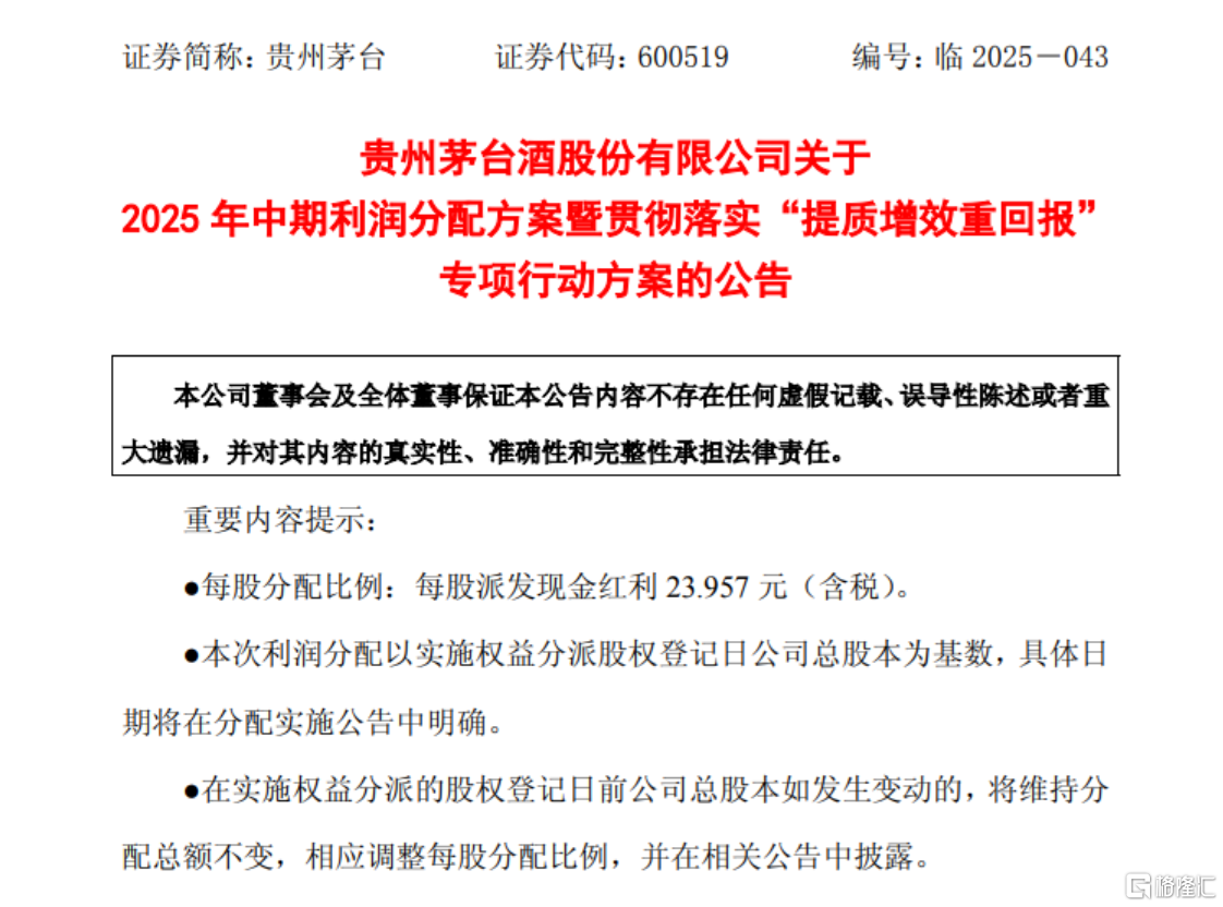 根据公告,公司拟向全体股东每股派发现金红利23.957元(含税)。以2025年9月30日公司125227.0215万股的总股本计算,本次合计拟派发现金红利约300.01亿元(含税)。