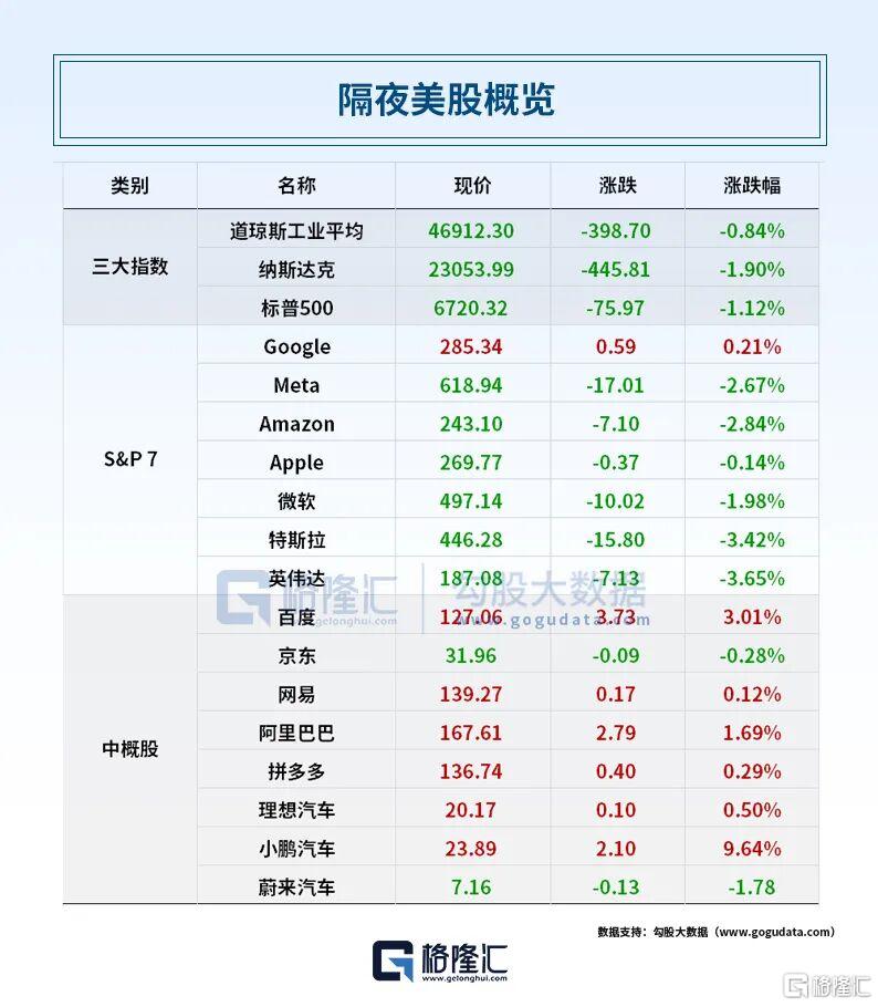 美股方面,三大指数集体收跌,纳指跌1.9%,标普500指数跌1.12%,道指跌0.84%。大型科技股普跌,英伟达、特斯拉跌超3%,英特尔、亚马逊、Meta跌超2%,微软跌超1%;谷歌小幅上涨。其中,微软连续七个交易日下跌,创2022年以来最长连跌天数。Robinhood跌近11%,创3月份以来最差单日表现。多邻国暴跌超25%,创有史以来最大单日跌幅。