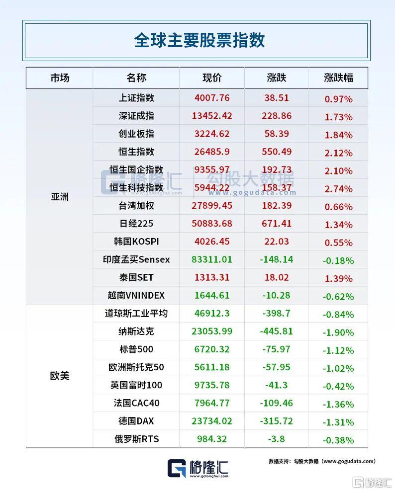 昨日,A股方面,沪指重回4000点,收涨0.97%报4004点,深证成指涨1.73%,创业板指涨1.84%,科创50指数涨3.34%。全市场成交额2.08万亿元,较前一交易日增量1816亿元。有色金属板块爆发,机器人板块活跃,半导体、存储芯片、电源设备等板块涨幅居前。海南板块回调,影视概念、免税概念及短剧概念等跌幅居前。