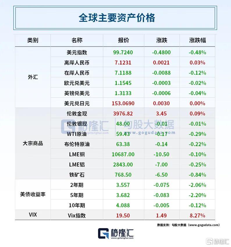 全球资产表现上,WTI 12月原油期货收跌0.29%,报59.43美元/桶;布伦特1月原油期货收跌0.22%,报63.38美元/桶。周四(11月6日)纽约尾盘,美国10年期国债收益率下跌7.01个基点,报4.0890%,全天处于下跌状态。金价“冲高回落”,现货黄金持平,报3979.03美元/盎司,COMEX黄金期货跌0.14%,报3987.40美元/盎司。