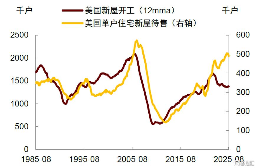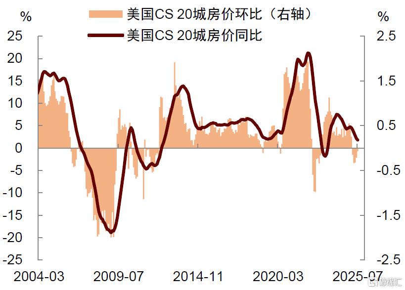 其他固定资产投资方面,房地产或将经历一轮“主动去库存”。虽然美联储的降息有望刺激住房销售,但开发商是否愿意重启新房建设仍有待观察。首先,当前待售库存依然偏高,开发商需要通过降价等方式加速去库存,这意味着房价可能继续承压(图表8)。美国20座主要城市的房价已连续五个月环比下跌,同比涨幅也从去年的5%降至1%(图表9)。其次,限制移民政策导致人口增速放缓,进一步削弱了房地产的需求端动力。这不仅增加了库存消化的难度与周期,也可能推迟下一轮住宅建设周期启动的时间。