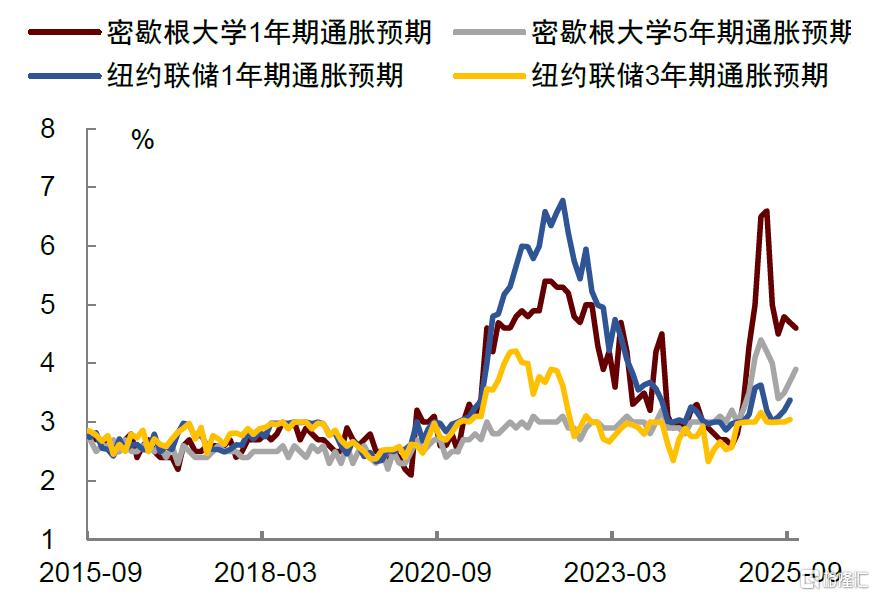 通胀方面,我们预计将表现出一定粘性。核心商品在关税影响下仍有涨价空间。房租通胀将延续当前的放缓趋势。非房租服务(supercore)价格受结构性需求与劳动力成本支撑,仍具韧性。消费者通胀预期面临抬升风险,通胀心理的再锚定也将使美联储实现目标更为困难。