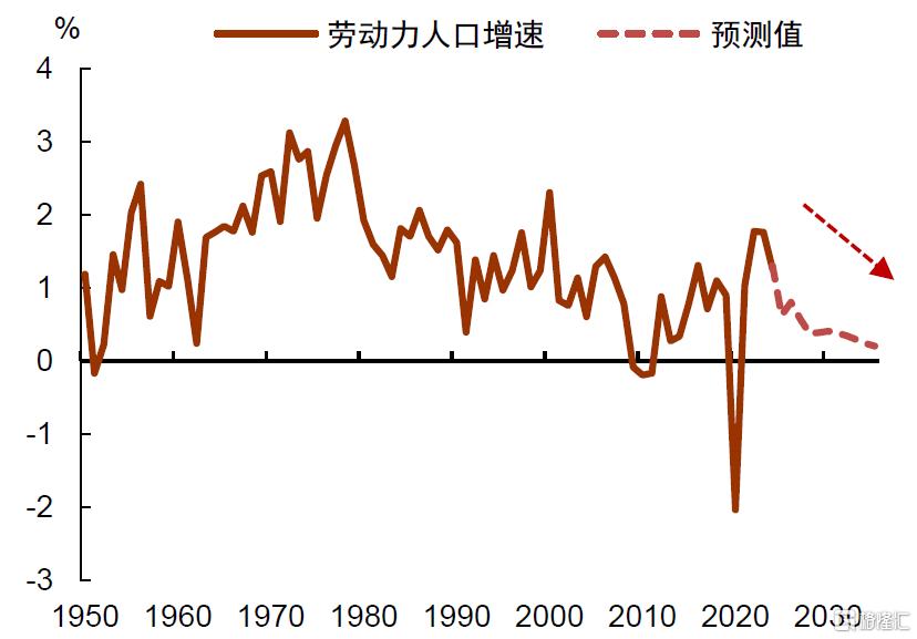 另一方面,提高关税与收紧移民政策将进一步强化逆全球化趋势,打破过去多年形成的要素配置格局,从而对效率产生抑制作用。这种效应与AI推动生产率提升的方向相反,在短期内可能相互抵消,难以判断哪一方力量更为主导。由此,一个合理假设是,AI带来的效率提升或难以完全抵消劳动力人口放缓的负面影响,经济供给增长将面临约束。