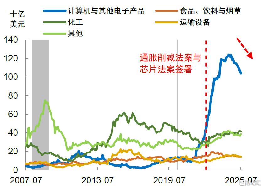 建筑投资处于政策补贴减退后的“退坡期”。受拜登政府《通胀削减法案》和《芯片与科学法案》驱动的投资高峰已过,建筑投资支出自2024年下半年起已进入了下行通道(图表10)。不仅如此,由该轮建筑投资带来的设备投资热潮(滞后18个月)也在2025年得到了充分释放(图表11)。同时,除人工智能领域外,尚未出现新的大规模建设需求。因此,我们判断建筑投资在2026年将延续下降趋势。