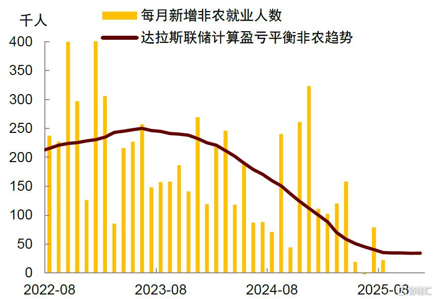 更值得关注的是移民政策的逆转。与拜登政府时期相对宽松的边境管理不同,特朗普政府强化了边境执法,导致新增移民人数明显下降。同时,特朗普还加大了对存量非法移民的遣返力度,并收紧了包括H1B在内的外籍劳动者签证。根据国会预算办公室(CBO)测算,由于移民人口减少,美国劳动力人口增速预计将从拜登时期的平均1.5%降至特朗普第二任期的平均0.6%(图表3)。其中,2025年的移民人数预测较此前的预测值减少了140万人,2026年预测值减少了87万人。今年以来美国非农就业增长明显放缓,也与劳动力供给趋紧有关。根据达拉斯联储的测算,新增就业人数的“盈亏平衡”水平将因移民减少而降至每月约3万人左右(图表4)。换言之,就业岗位每月增加约3万即可维持失业率稳定,而低就业增长也将成为未来一段时间的常态。