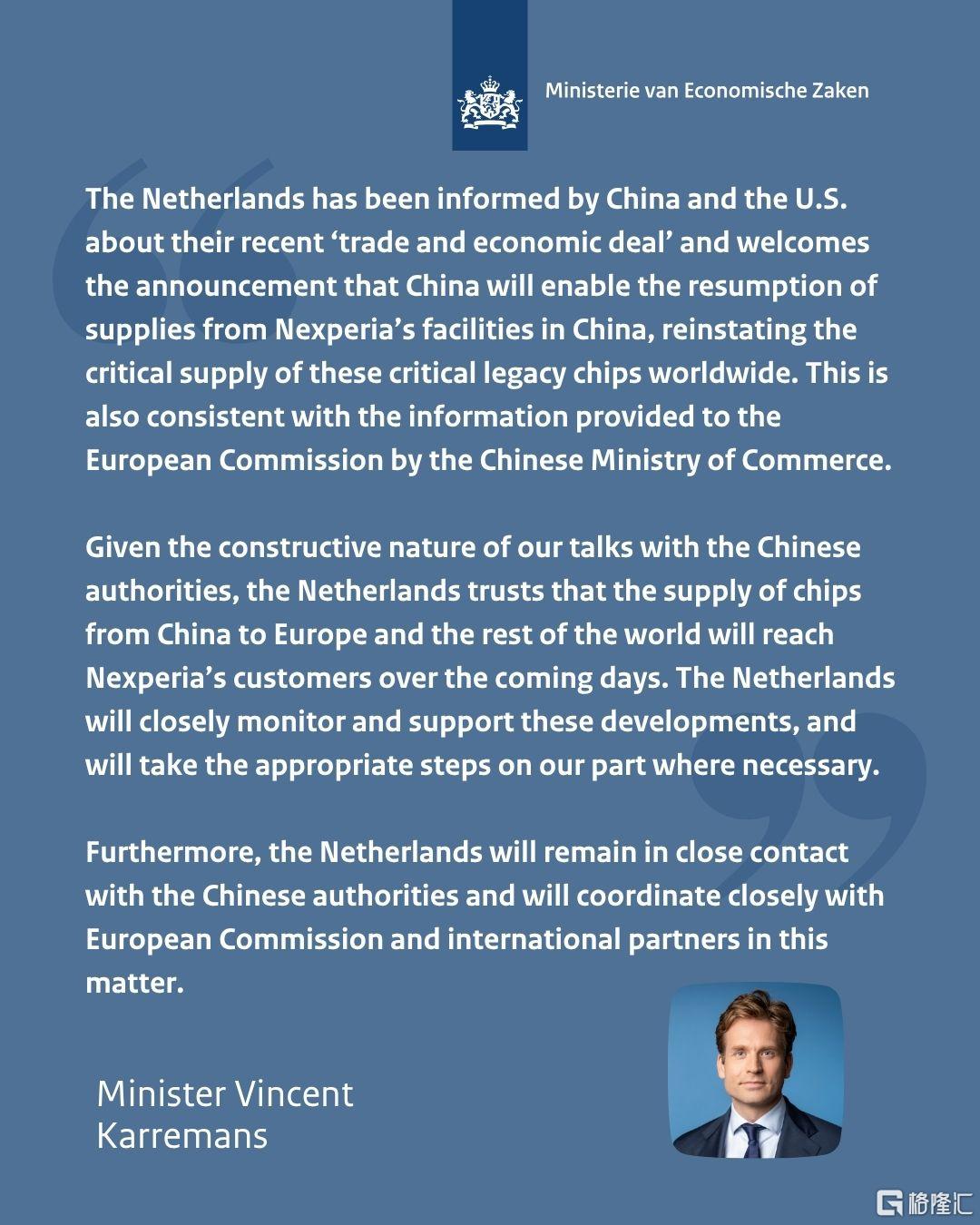荷兰政府11月7日发布声明称,荷兰经济大臣卡雷曼斯表示,欢迎中方会为安世中国工厂恢复供货提供便利的表态,“鉴于我们同中方的会谈富有建设性,相信中国供应至欧洲和世界其它地区的芯片将在未来几天送达安世客户手中”。卡雷曼斯称,荷方将继续与中方保持密切联系,并将就此事与欧盟委员会和国际伙伴密切协调。