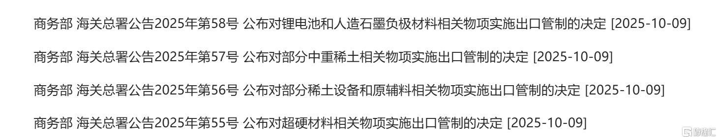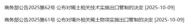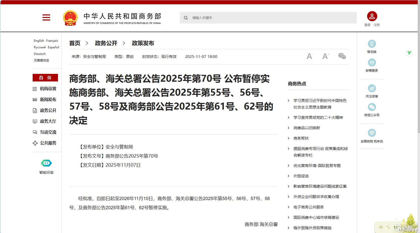 11月7日,据商务部网站,经批准,自即日起至2026年11月10日,商务部、海关总署公告2025年第55号、56号、57号、58号,及商务部公告2025年第61号、62号暂停实施。公告涉及暂停实施相关出口管制措施,具体包括超硬材料、部分稀土设备和原辅料、锂电池和人造石墨负极材料、部分中重稀土等相关物项。
