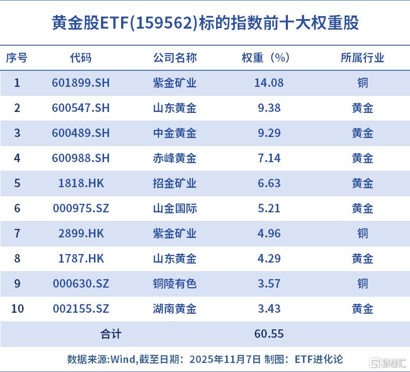 其中,黄金股ETF是股票型ETF,投资于在港A股上市的黄金相关公司,权重股聚焦金矿股,如紫金矿业、山东黄金、中金黄金等,也包含珠宝零售公司,如老铺黄金、周大福等。