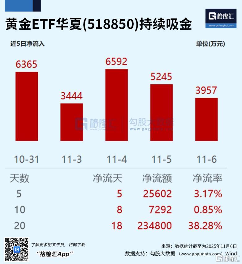 11月以来(截至11月6日),国内黄金ETF市场吸金态势极为强劲,有多只产品斩获大额净流入,其中黄金ETF华夏(518850)近5日连续净流入,规模为2.56亿元,近20日来共有18日均呈现净流入,累计净流入额达到了23.48亿元,净流率38.28%。