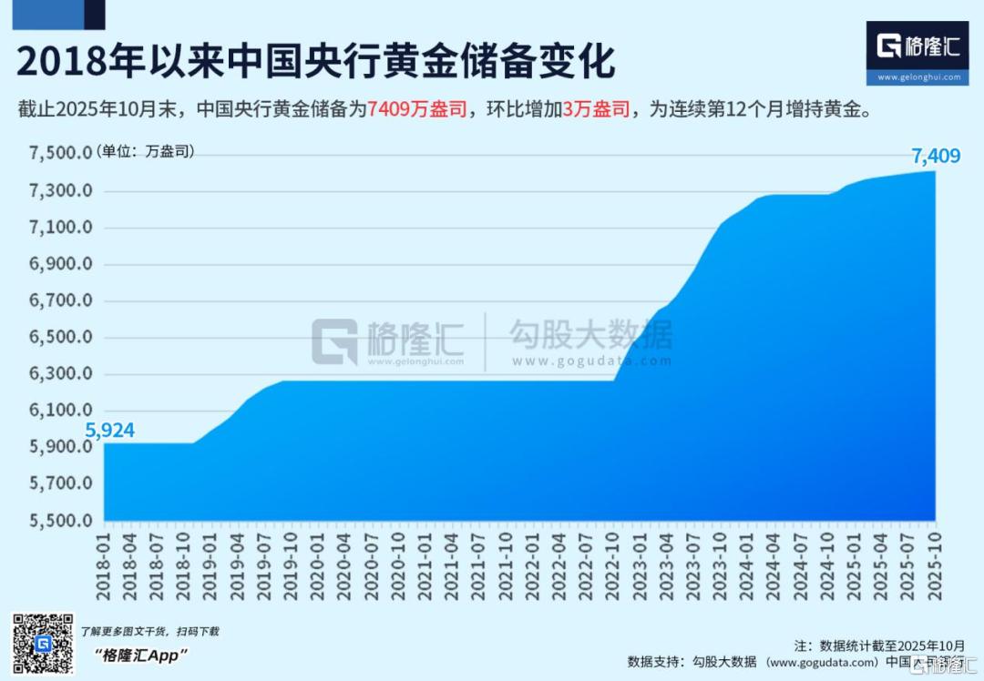 就在刚刚,中国央行发布数据显示,中国10月末黄金储备报7409万盎司(约2304.457吨),环比增加3万盎司(约0.93吨),为连续第12个月增持黄金。