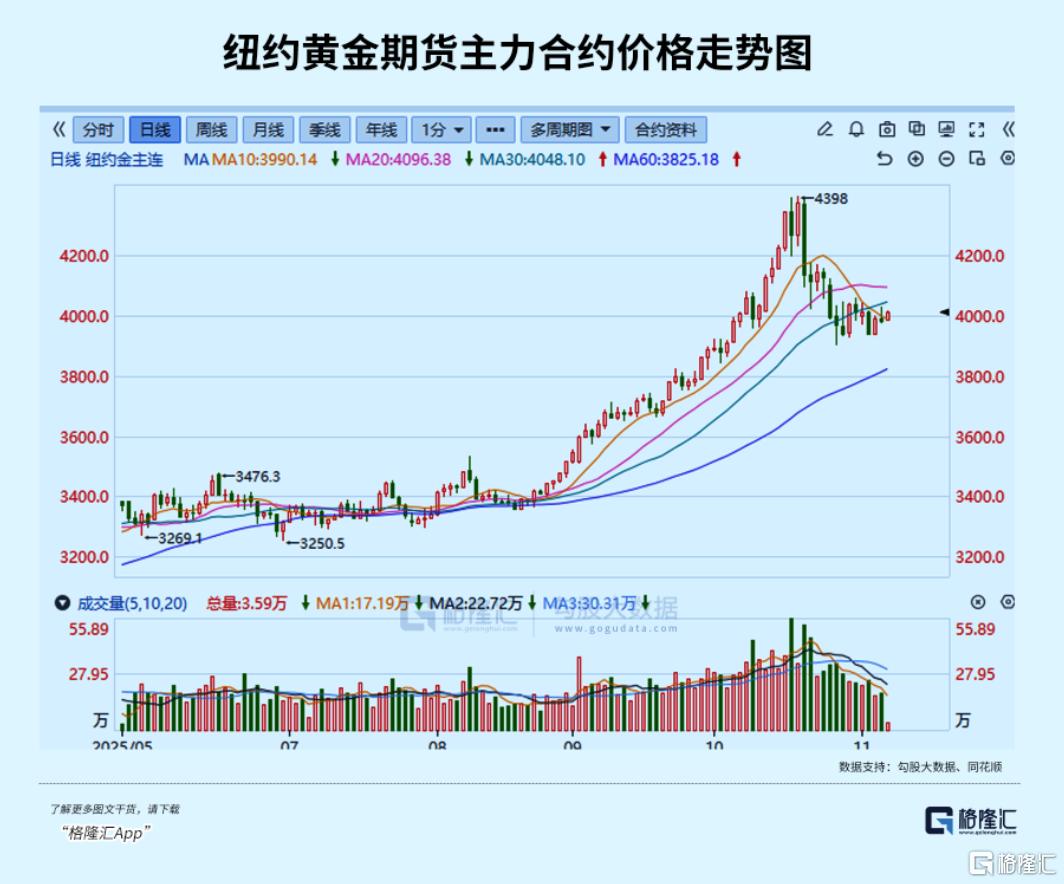 至今,纽约黄金价格从10月20日最高4398美元/盎司一度跌破3900美元关口,期间跌幅超过10%。