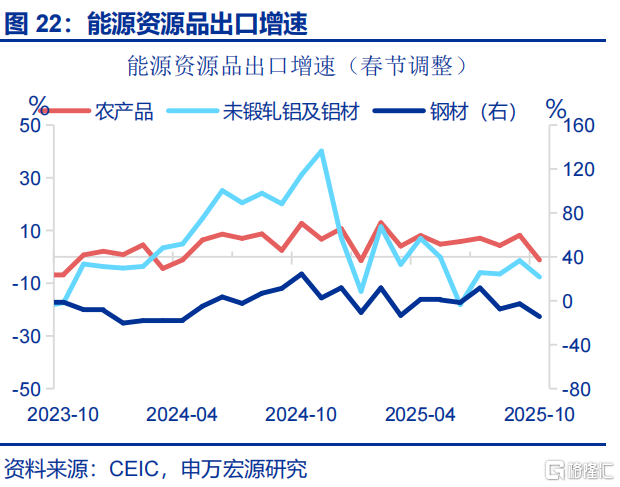 资本品出口增速分化,中间品出口增速回落。资本品方面,通用机械(-33.9pct至-9.1%)、医疗仪器及器械(-9.8pct至-1.0%)出口增速有所下降,而船舶(+25.7pct至68.4%)增速有所上升。中间品方面,汽车零配件(-16.9pct至-11.6%)、集成电路(-5.8pct至26.9%)出口增速回落。此外,能源资源出口增速大幅回落(-7.5pct至-4.0%)。其中稀土(-54.2pct至42.9%)、钢材(-11.7pct至-14.4%)、未锻轧铝及铝材(-6.2pct至-7.7%)。