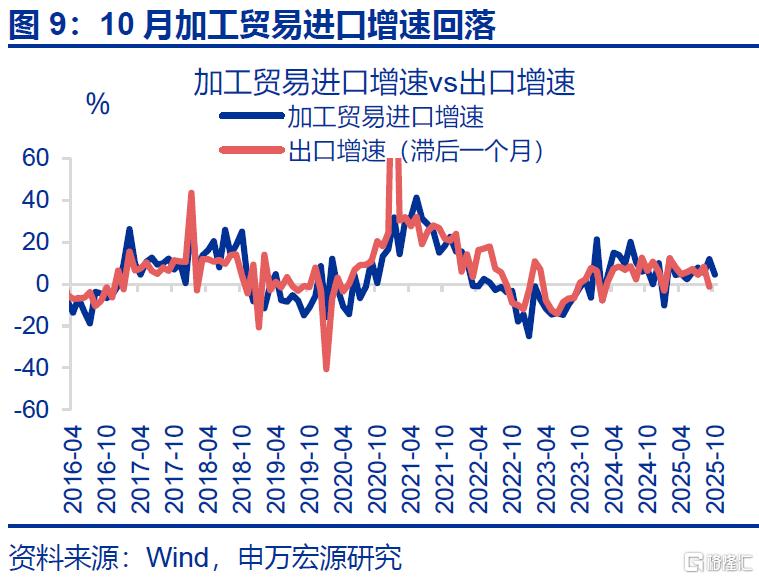 进口方面,加工贸易进口在前月走强的背景下,本月也有明显回落,或亦反映供给对本月外贸数据的扰动。10月进口(美元计价)同比回落6.4pct至1%。其中,加工贸易进口9月大幅上行6.6pct至12%,而10月回落7.3pct至4.6%,也反映供给的扰动较大。