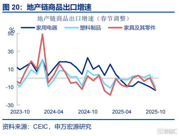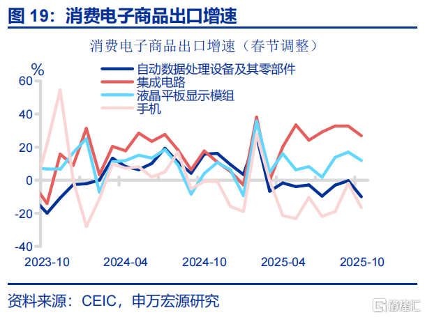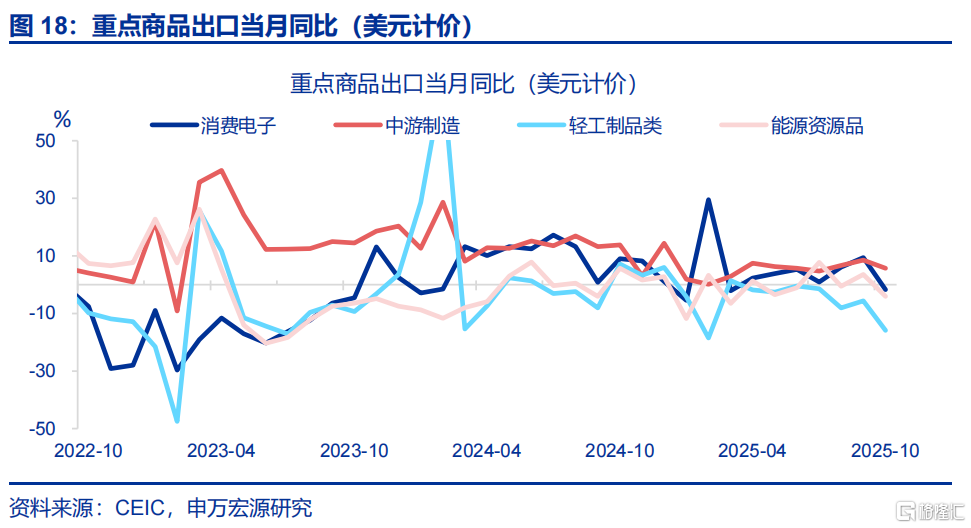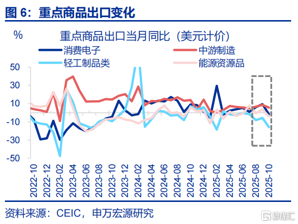 消费品方面,消费电子、轻工制品出口均有回落。根据海关公布的10月重点商品数据,消费电子出口增速大幅下降(-11.1pct至-1.7%),结构上手机(-14.7pct至-16.6%)回落幅度较大。10月轻工制品出口增速也有所回落(-10.2pct至-15.9%),其中纺织纱线(-15.5pct至-9.1%)、家具及其零件(-13.0pct至-12.7%)、鞋靴(-7.7pct至-21.0%)。