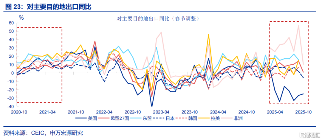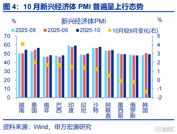 10月出口同比大幅回落,主因或并非外需走弱。10月出口同比(美元计价)较9月大幅回落9.4pct至-1.1%,虽然一定程度上受到基数走高的影响,但环比(-7.1%)仍明显弱于季节性(-3.2%);从驱动因素看,外需下滑无法完全解释本月出口下行;10月对美国出口高基数下仍在回升(+1.8pct至-25.1%),回落主要源于对新兴经济体(-11.3pct至4.5%),其中对东盟(-4.7pct至11%)、对拉美(-13.1pct至2.2%)、对非洲(-46.1pct至10.5%)出口增速明显回落,但10月越南、泰国、南非、巴西等地PMI边际分别上行4.1、2、1.7、1.7pct至54.5%、56.6%、48.3%、48.2%,且年中以来均在持续改善,新兴经济体需求也并未出现明显走弱迹象。