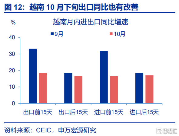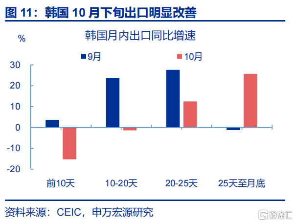 但10月下旬开始,港口外贸货运量飙升显示供给影响已在消退,受中国产业链辐射的越南韩国等出口也明显改善。考虑到“货物生产-出口报关”的时滞,9月下旬“抢生产”逐步退坡后,港口外贸货运量在10月中上旬明显回落至1.9%;伴随节后生产逐步恢复,10月最后一周港口外贸货运量明显冲高,同比上行至20%较高水平。受国内产业链辐射的韩国、越南10月出口也呈现“U型”走势,10月上中旬出口同比增速较弱,但下旬明显改善;譬如越南10月前15天出口增速为18.5%,明显低于9月同期(33.2%),但下旬(16.7%)已基本持平9月同期(18.6%);韩国10月下旬出口增速更是较上旬上行13.3pct至25.7%,亦显示供给扰动的消退。