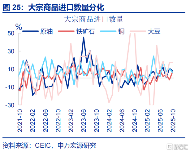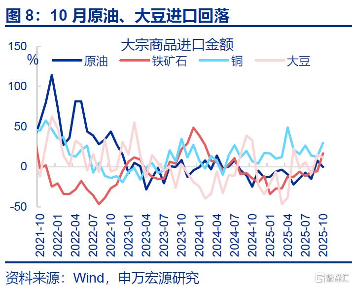 10月进口增速有所回落,机电产品与大宗商品进口均有所下降。10月进口(美元计价)同比-6.4pct至1.0%。具体来看,机电产品进口增速较上月有大幅回落(-7.6pct至2.5%),其中自动数据处理设备及其零部件(-15.3pct至-27.2%)回落幅度最大。大宗商品进口表现分化。进口数量方面,铜(-4.5pct至6.1%)、原油(-2.4pct至8.2%)、大豆(-0.1pct至17.2%)有所回落,铁矿石(+9.2pct至7.2%)有所回升。