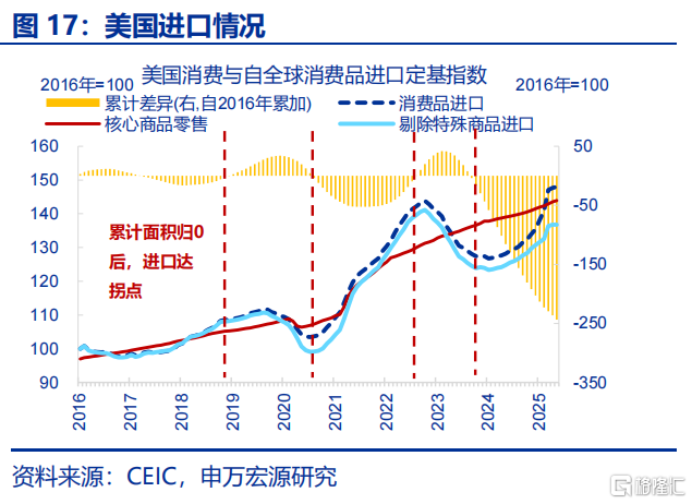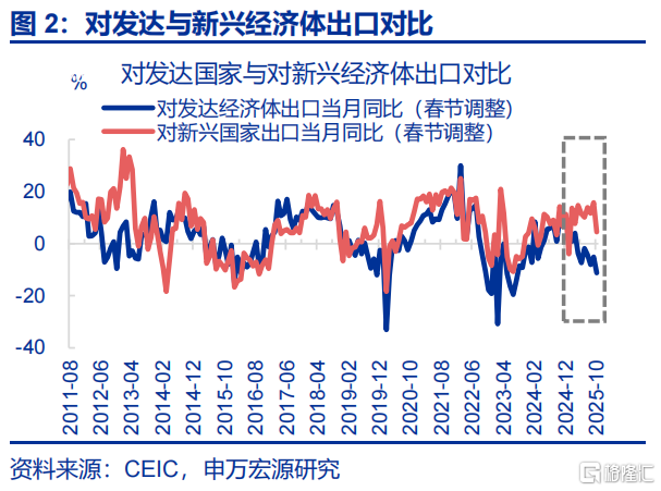 展望未来,10月底中美“关税政策”迎来缓和,加之我国在新兴份额持续提升下,预计11月出口可能会有恢复。本月对发达经济体出口出现分化,其中对欧英出口有较大回落,或与其补库空间较小有关;而对美出口仍在回升1.8pct至-25.1%,可能体现美国补库仍对进口形成拉动。同时中美关税出现进一步缓和,芬太尼关税降低10%基本对应支撑当月出口同比1个百分点左右(关税1.0时期、今年4月以来出口弹性均在1倍左右),后续对美出口可能仍有空间。与此同时,新兴国家工业化、城镇化提速带来增量的生产资料进口需求,以及我国在新兴市场份额持续提升等逻辑,我国中间品、资本品出口仍有韧性,预计11月出口可能会有恢复。