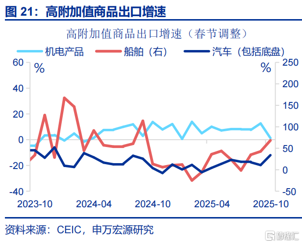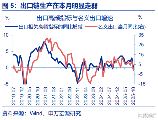 短期供给扰动才是拖累出口主因,或与前期“抢生产”结束以及工作日天数减少有关。10月工作日同比较前月减少3天,考虑到国庆节后一周休假情况也居多,进一步放大了工作日减少对供给的拖累;9月受长假的影响,制造业“抢生产”现象明显,但10月对应退坡。10月出口回落的基本上都是9月走强的商品;消费电子、轻工制品等劳动密集型行业出口跌幅也更大;高频出口链生产同比下滑至-0.2%、与10月出口增速(-1.1%)对应。